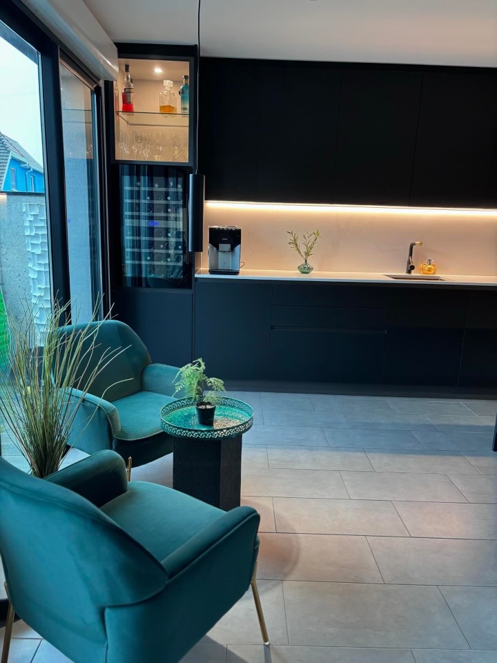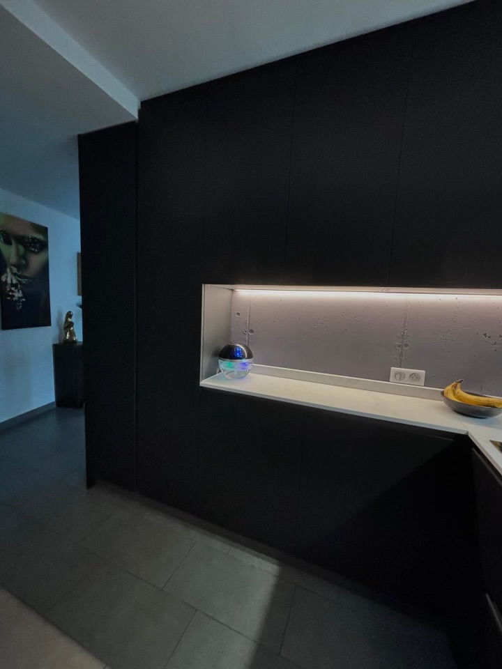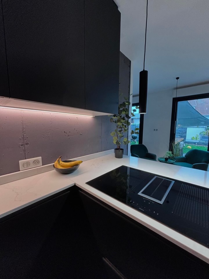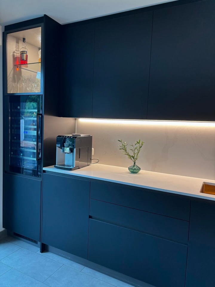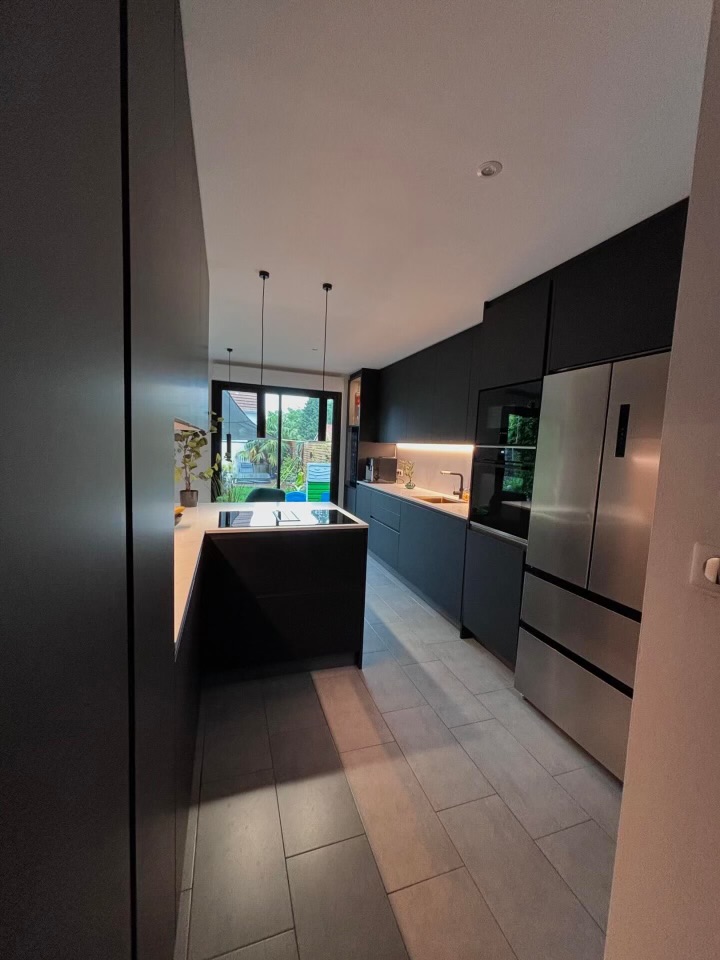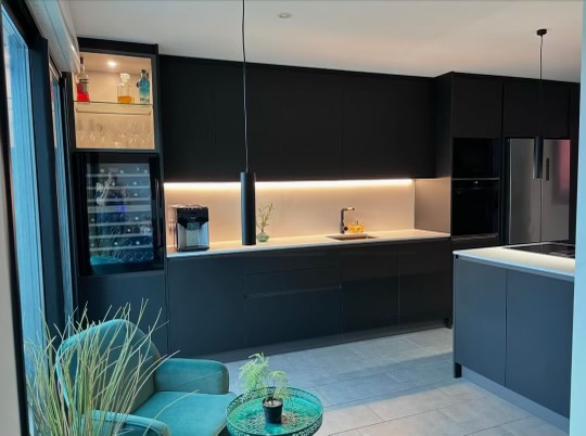 Pose cuisine secteur UBERACH. Façade en FENIX NOIR version XXL avec les profils métal anthracite. Les versions XXL nous permettent de vous travailler un plan de travail assez haut et confortable. Cette implantation est très optimisée suite aux meubles toute hauteur et un retour îlot avec la plaque de cuisson et du rangement à l’arrière.Les petits plus : une plaque aspirante Falmec 2 zones libres, une cave à vin en hauteur Le Chaï et une belle vitrine avec prise de main cadre métal sans oublier le plan de travail en QUARTZ.