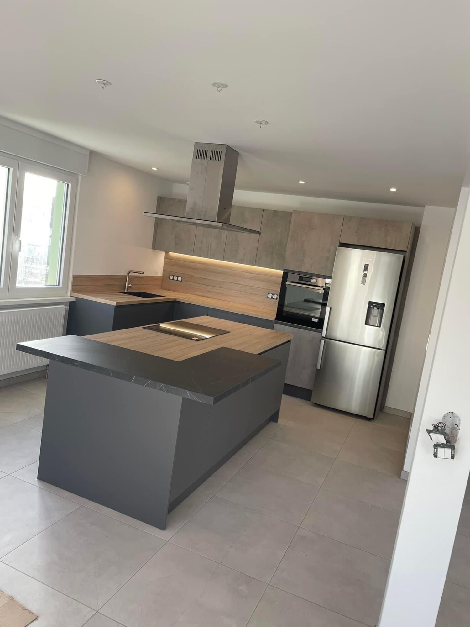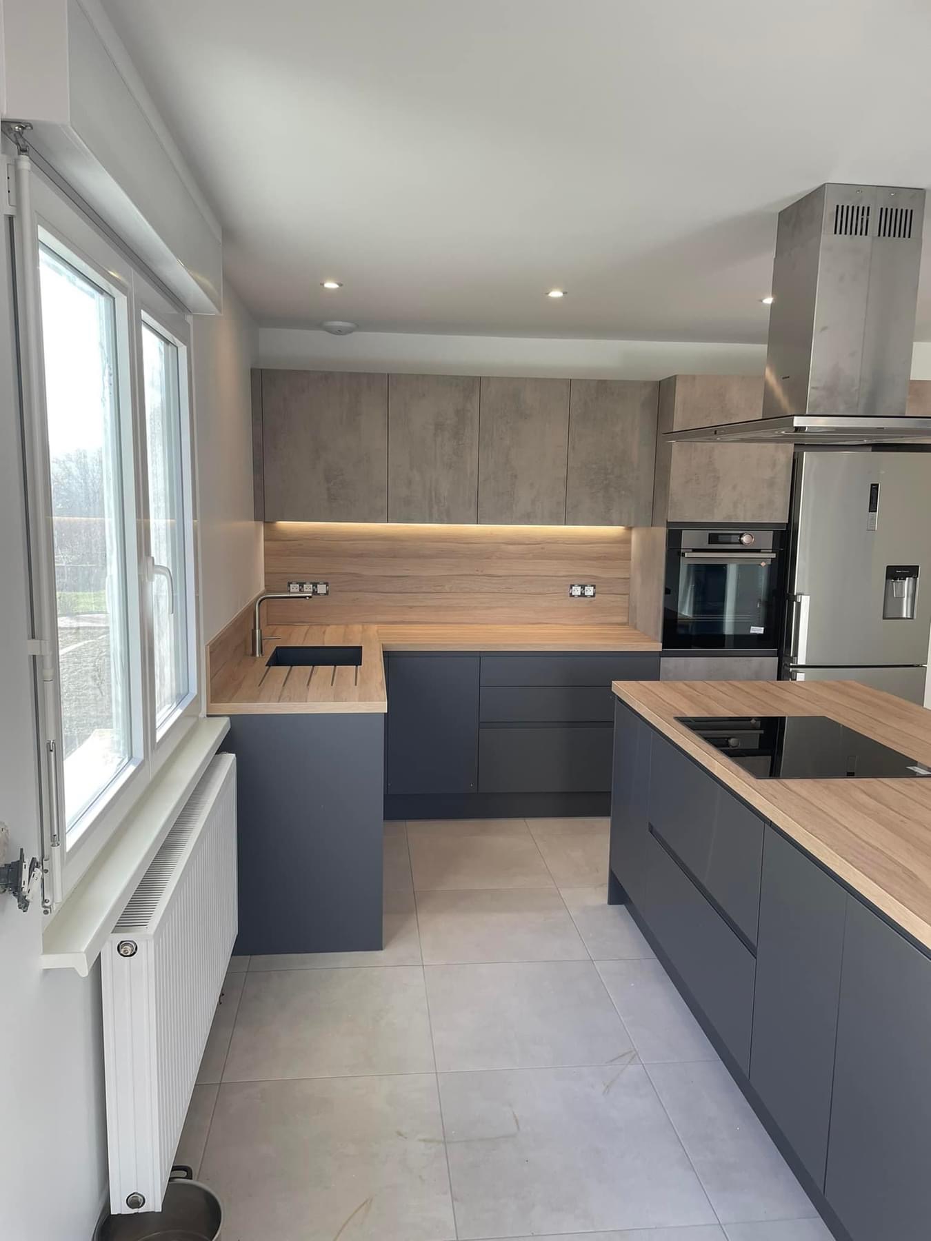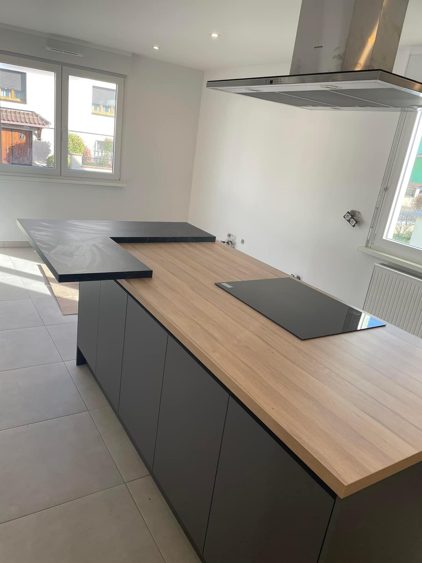 Pose cuisine secteur UBERACH avec un duo de façades finitions effet béton Cenere et un Pet gris anthracite avec poignée intégrée de série. Colonne four avec une poignée métal anthracite sur le chant de la façade et les ouvertures des meubles hauts se font en profil interne. Nous avons un plan de travail en COMPACT ép 4 cm effet bois le COC148LIM avec un léger noiré, une cuve sous plan en résine noire avec les rainures égouttoir, un mitigeur total inox. L’îlot est tourné vers la pièce de vie avec une plaque de cuisson et une hotte décorative, on a une belle surface de plan de travail et du rangement supplémentaire à l’avant. N’oublions pas la tablette bar en L avec les nouveaux décors ultra mats marbrés.