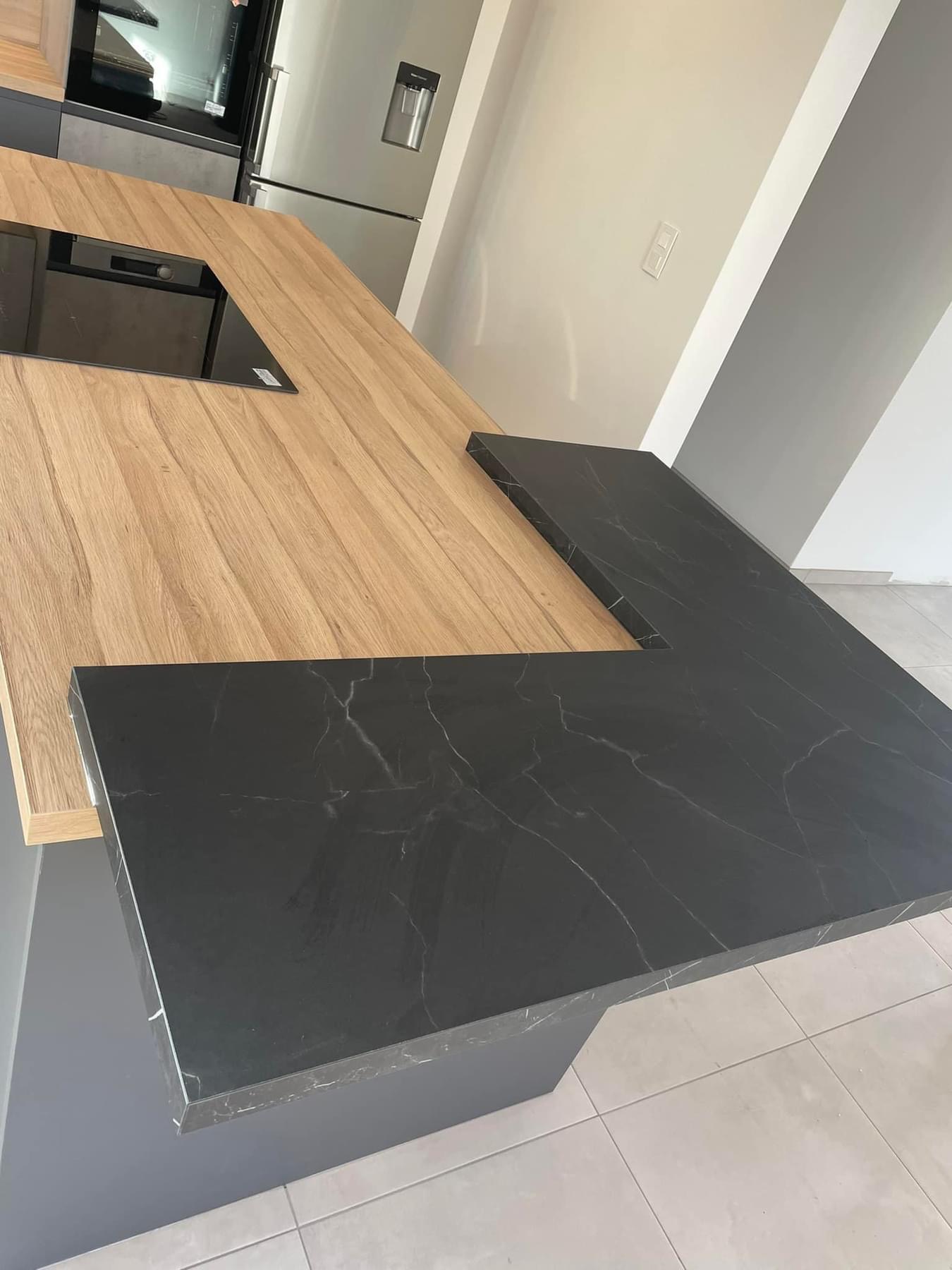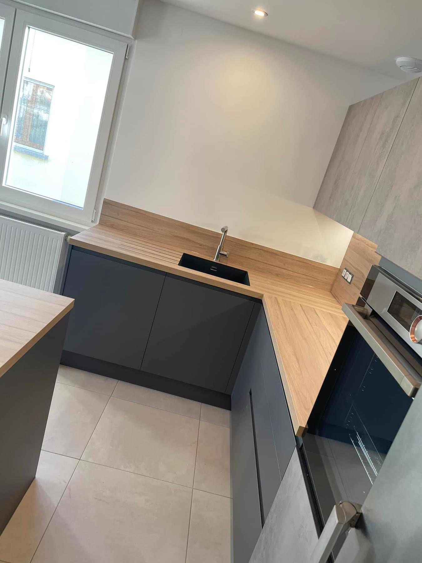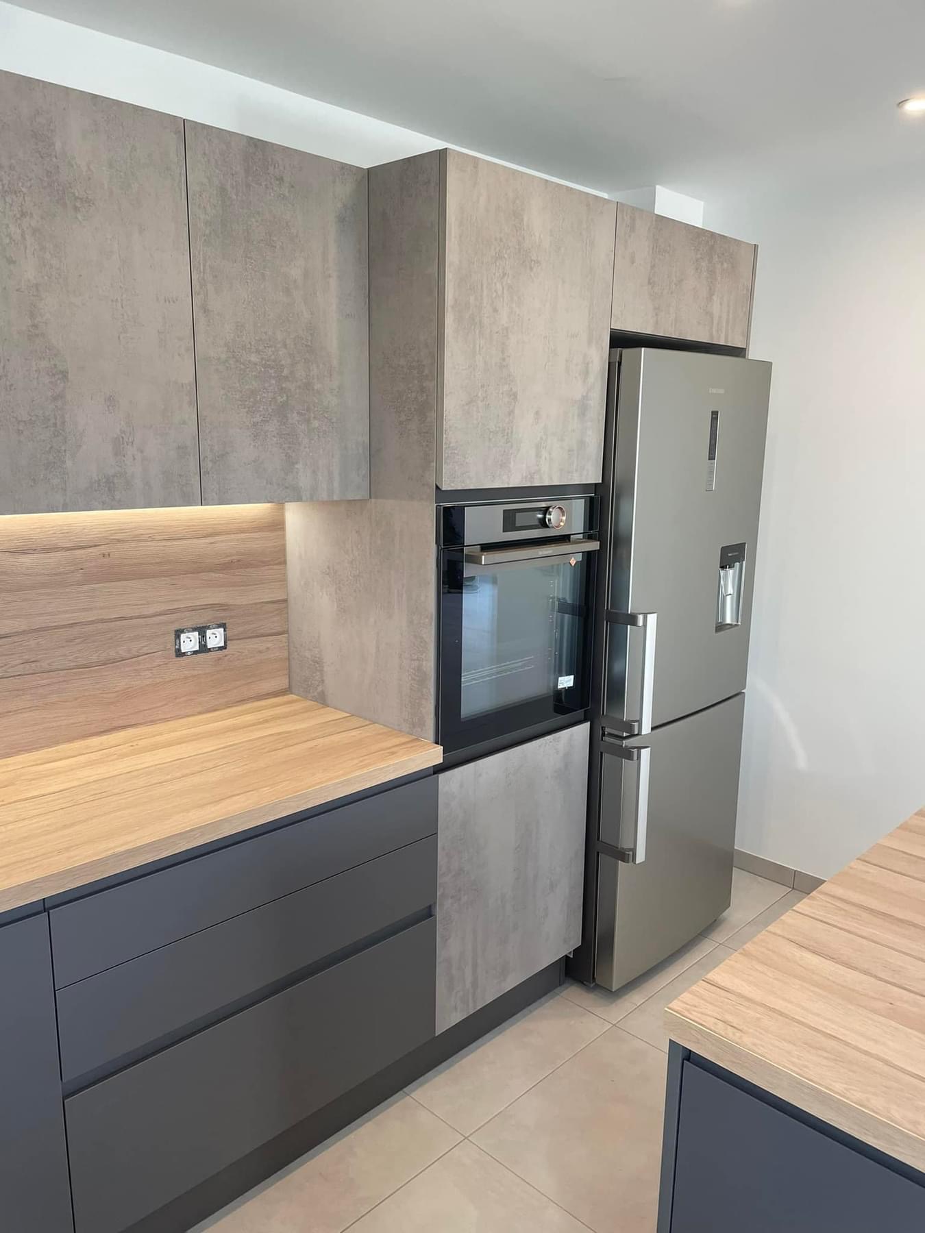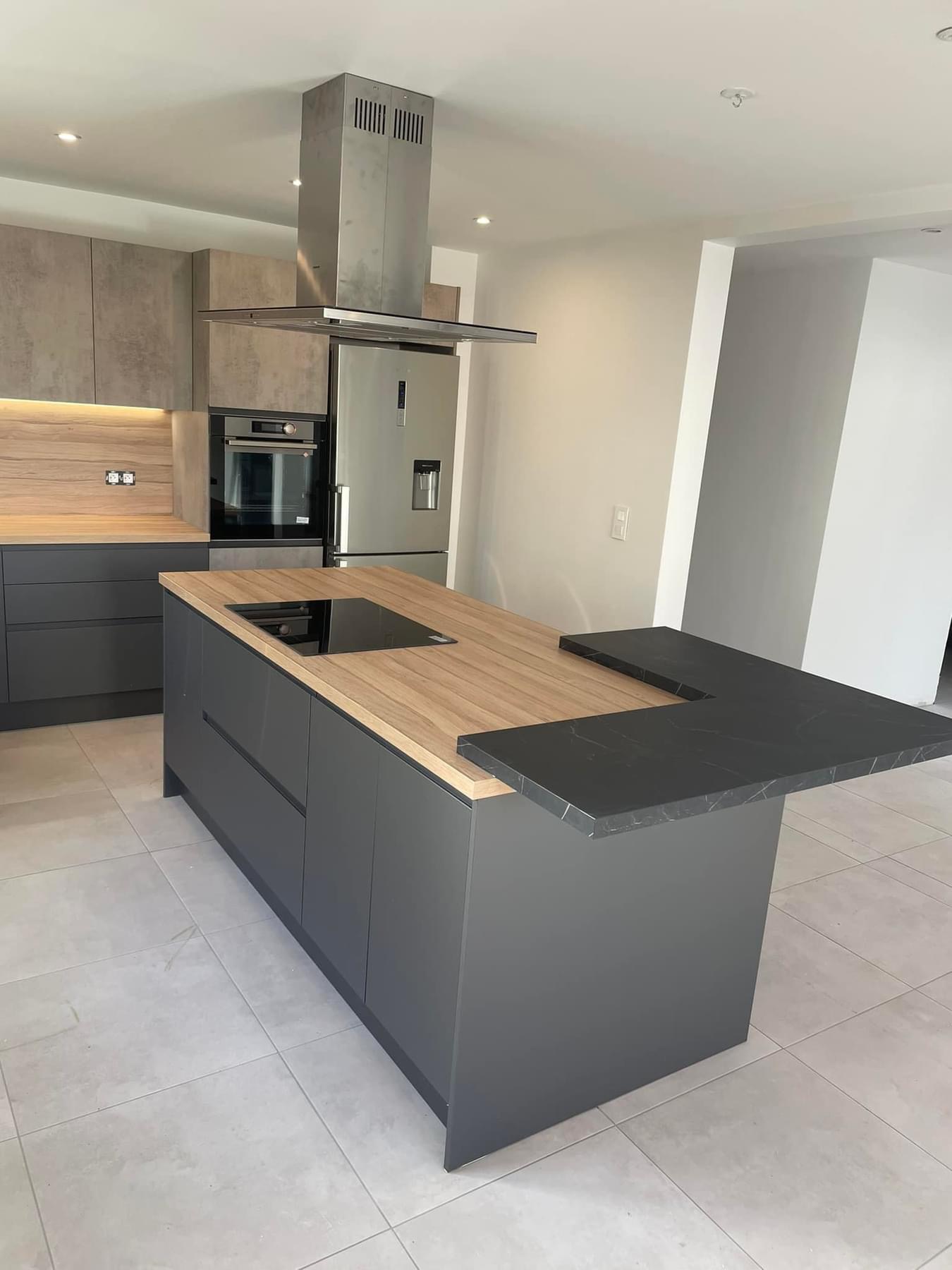 Pose cuisine secteur UBERACH avec un duo de façades finitions effet béton Cenere et un Pet gris anthracite avec poignée intégrée de série. Colonne four avec une poignée métal anthracite sur le chant de la façade et les ouvertures des meubles hauts se font en profil interne. Nous avons un plan de travail en COMPACT ép 4 cm effet bois le COC148LIM avec un léger noiré, une cuve sous plan en résine noire avec les rainures égouttoir, un mitigeur total inox. L’îlot est tourné vers la pièce de vie avec une plaque de cuisson et une hotte décorative, on a une belle surface de plan de travail et du rangement supplémentaire à l’avant. N’oublions pas la tablette bar en L avec les nouveaux décors ultra mats marbrés.