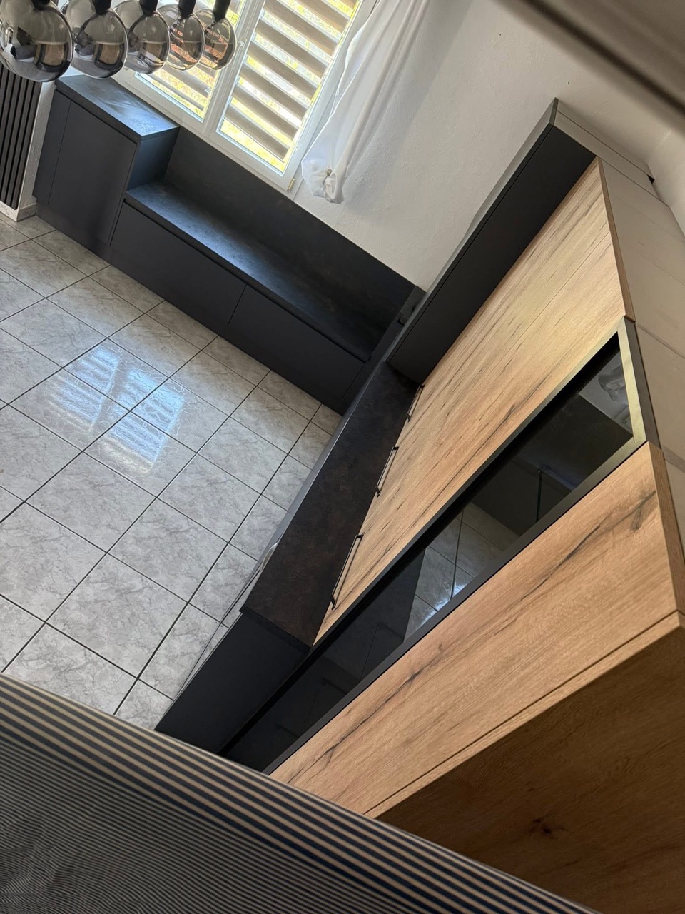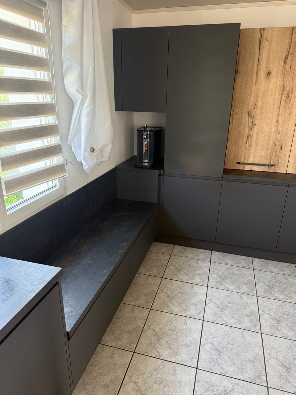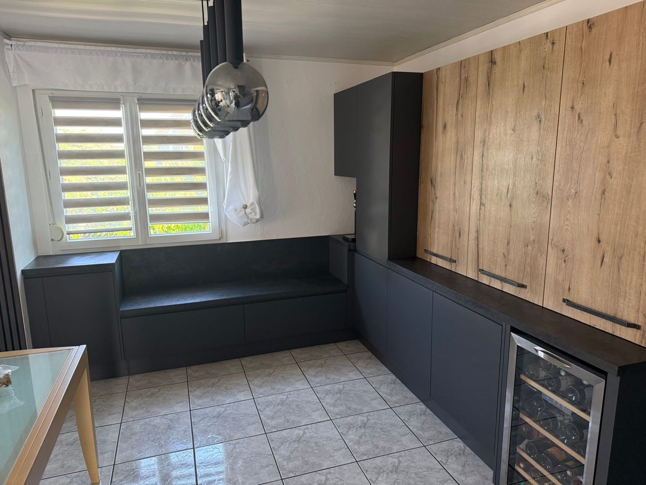 Pose mobilier divers pour coin billard secteur Haguenau. Duo de teintes, à savoir : façade finition stratifié en PET anthracite avec des meubles sur-mesures en effet bois. On retrouve différents types d’ouvertures : une poignée intégrée sur chant finition métal anthracite, du push-pull pour les meubles bas côté cave à vin, une poignée standard sur façade, un profil interne pour le meuble haut sans oublier la vitrine de la gamme OFFICINA (verre fumé) de chez Arrex dont l’ouverture se fait sur toute la hauteur. Le plan de travail a une ép de 1.4 cm finition stratifié “FUSION”. Belle composition ! Merci à nos clients pour leur confiance!